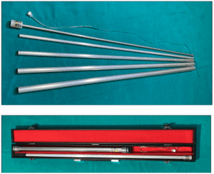 Dispositivo constituido por cinco tubos concéntricos de aluminio, de 70 cm de longitud y grosor de pared de 1,22 mm, tubo rellenable de material plástico transparente 80 cm de longitud y de 1 mm de diámetro interior y 3 mm de diámetro exterior, y tubo extensible de aluminio para la colocación en el eje del FOV, de acuerdo con la norma NEMA.