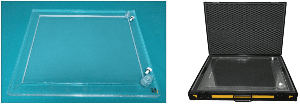 El maniquí de inundación ofrece un medio simple y eficiente de obtener una valoración óptima de la cámara con respecto a la uniformidad de la respuesta en toda la superficie de cristal. Su diseño en forma rectangular contiene una cavidad central estanca en la que se introduce una solución radiactiva a través del orificio de inyección, y se homogeniza por agitación. Una vez se ha distribuido la actividad de manera uniforme, se termina el proceso de llenado y se direcciona el aire que permanecía en el interior hacia el orificio de llenado, obteniendo una fuente uniforme, con el campo de visión libre de burbujas.